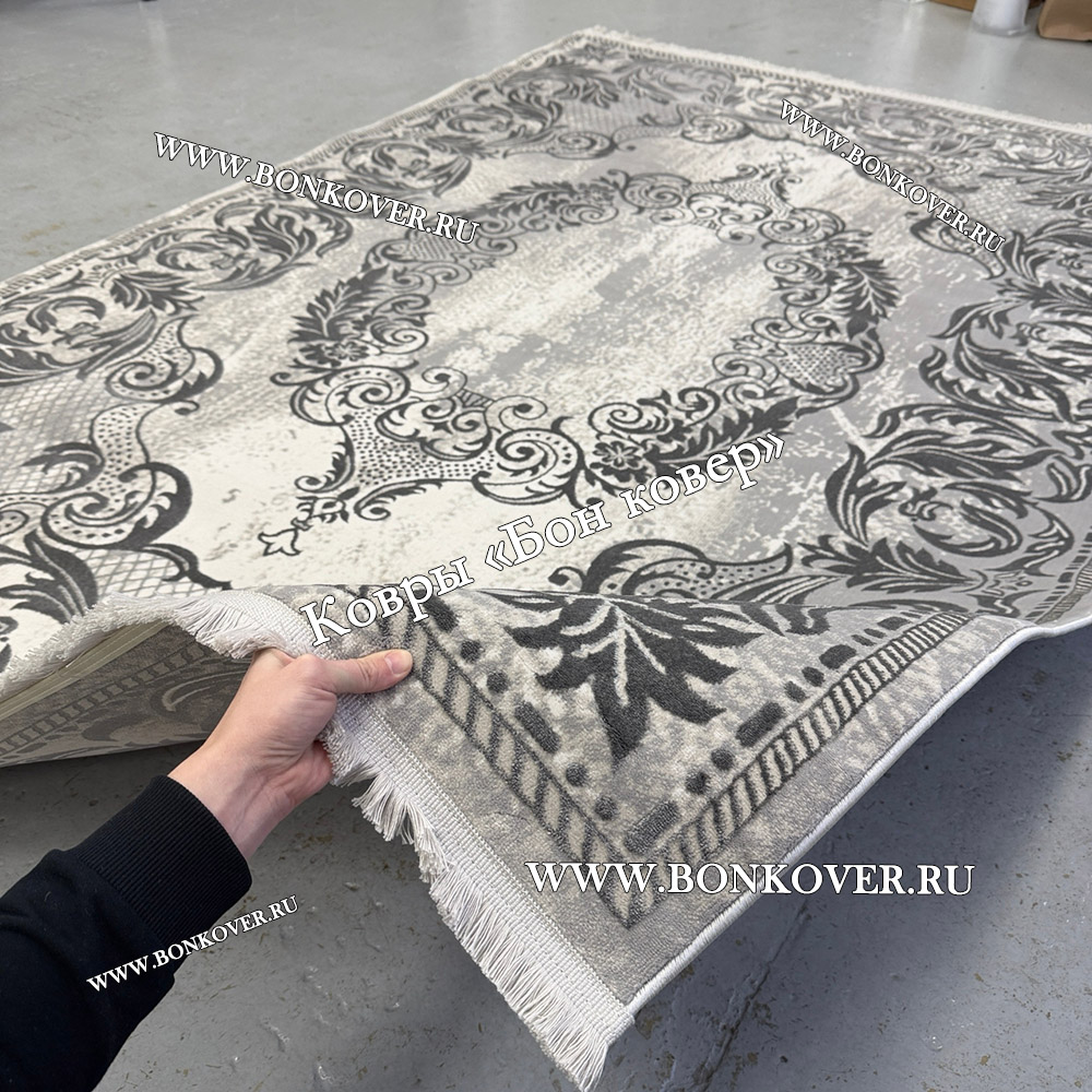 Красивый Ковер Для Гостиной Медальон Дизайн 30544 Серый наполняет интерьер комнаты теплом и уютом, гармонично сочетает в себе изящество и стиль. Он соткан из современных материалов, прочный и долговечный.